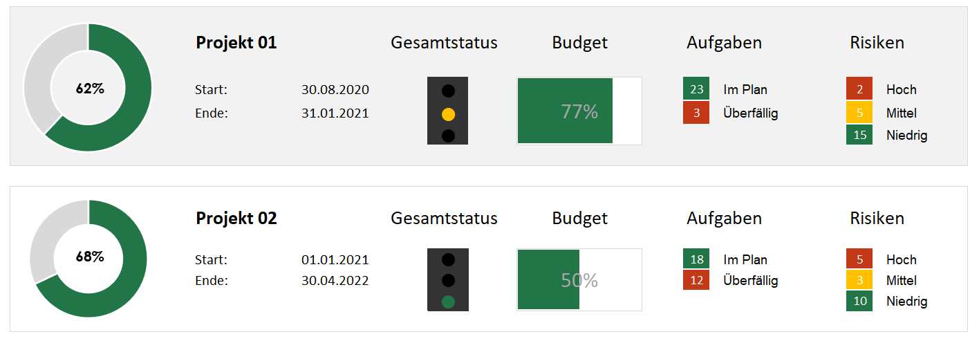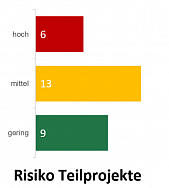 Meilensteinpläne, Gantt-Diagramme, Burn Down Diagramme, Projektbudgets, Soll-IST-Analysen, Risikodarstellungen, Kostenanalysen, Visualisierungen von Projektstatus, Projektfortschritt und Projektbudgets, Übersichten Teilprojekte bzw. Teilaufgaben, Projekt-Kennzahlen-Darstellung z.B. mittels: Ampel-Charts, Tachometer-Diagrammen, Waffel-Diagrammen, Batterie-Diagrammen, Ball-Diagrammen, Kreis- und Balkencharts, Bullet-Diagrammen u.v.m. (siehe auch Screenshots)