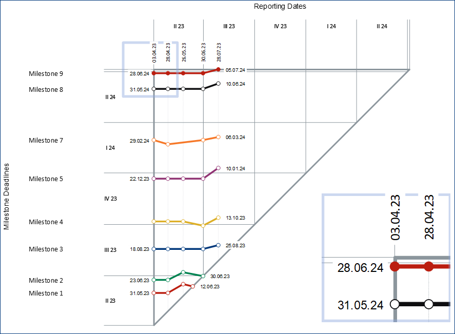 Due to its high information density and clarity, it is suitable for reports to the higher decision-making level. As it records the development of milestones, it can provide evidence for extensive detailed analyses at the end of the project (lessons learned).