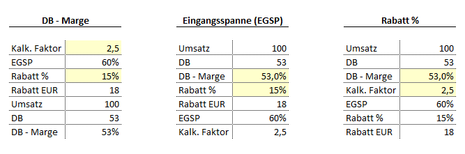Hier wird Ihnen bei der einzelnen Berechnung angezeigt, wie hoch der prozentuale Rabatt sein darf, wenn Sie z.B. eine DB – Marge von 53% erzielen möchten und Ihr Kalkulationsfaktor/Aufschlagsfaktor bei 2,5 liegt. Auf umgekehrtem Wege werden auch die DB-Marge und die Eingangsspanne berechnet.