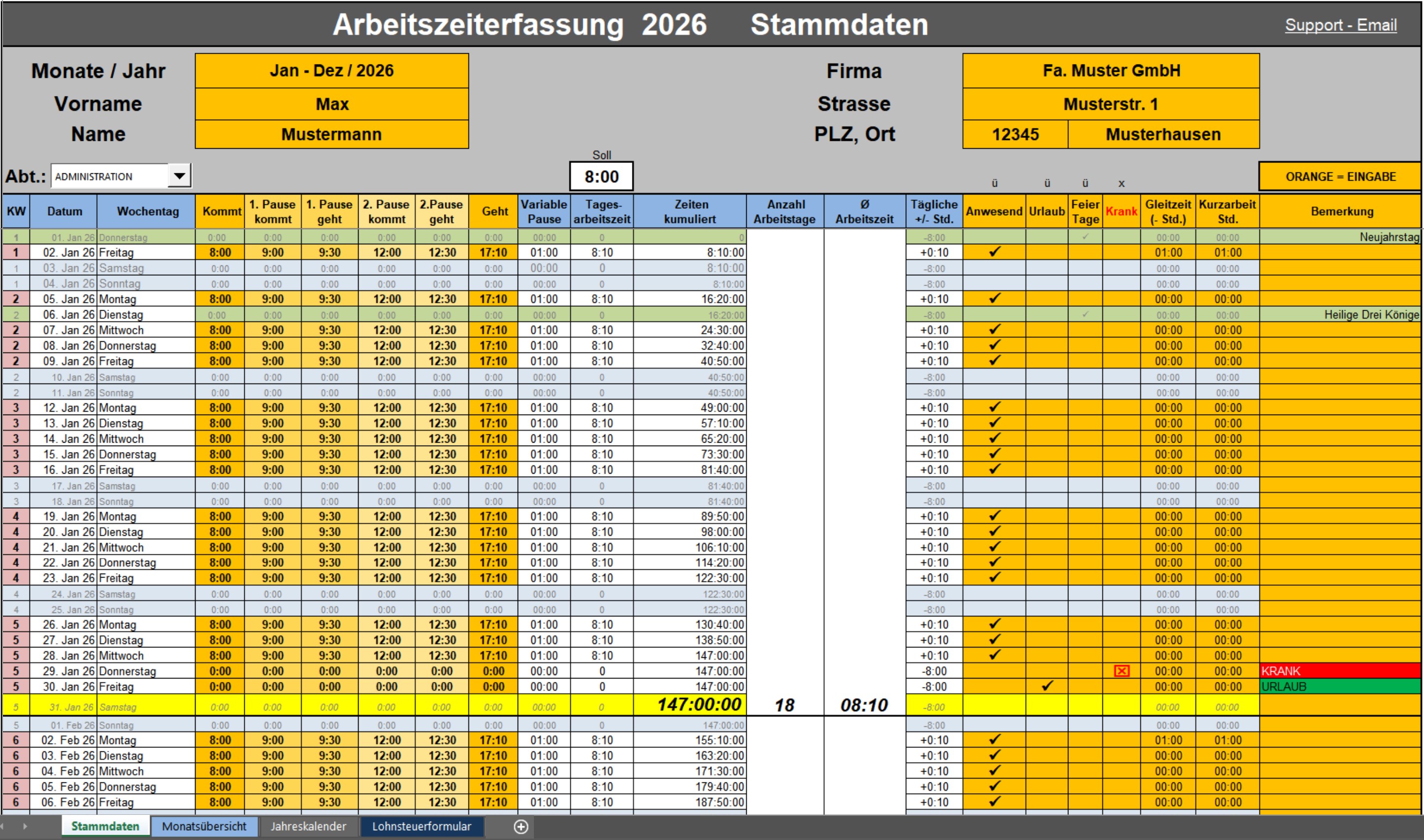 Stammdaten: Im oberen Bereich werden in den orangenen Feldern die Voreinstellungen eingetragen - darunter die täglichen Daten wie Kommt, Geht, Anwesend, Urlaub, Krank, Feiertag, Gleitzeit, Kurzarbeit und Bemerkungen. Bei Urlaub, Krank und Feiertage werden