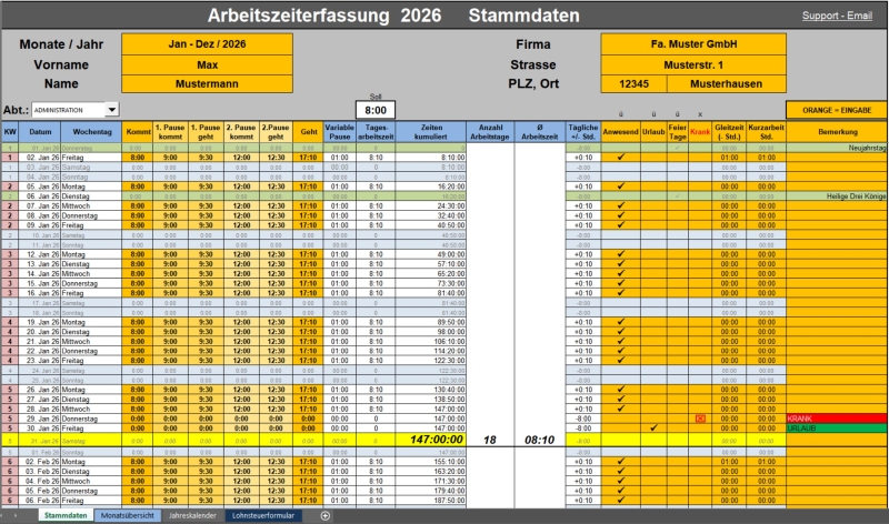 Mit diesem Arbeitszeiterfassung- Programm auf Excel Basis haben Sie Ihre geleisteten Arbeitszeiten jederzeit leicht überschaubar und voll im Griff. Sie können Ihre Arbeitszeiten bequem erfassen und auswerten. Diese Arbeitszeiterfassung ist durch ihre farbliche Gestaltung leicht zu verstehen und bedienungsfreundlich.