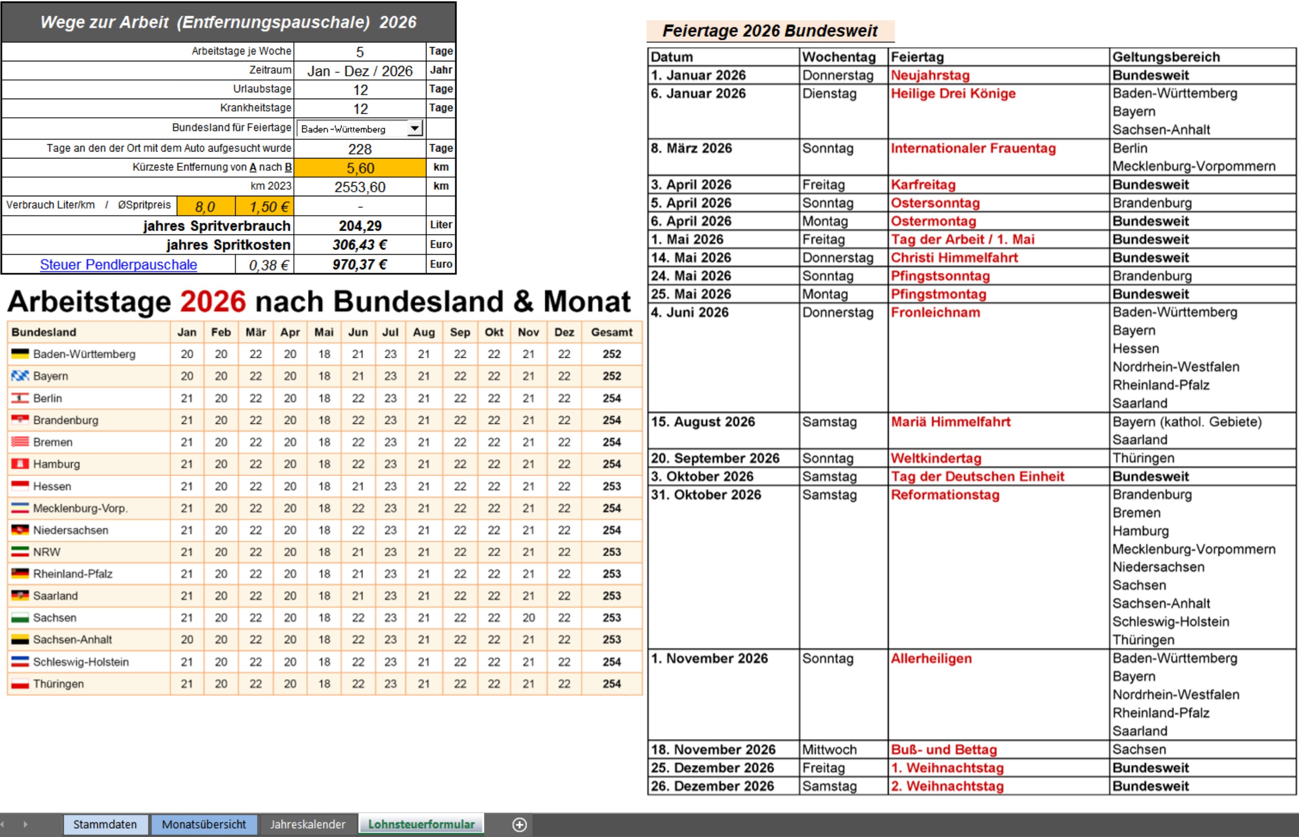 Lohnsteuerformular: Dies sind Parameter für die Berechnung der Steuer Pendlerpauschale. Hierbei werden die orangenen Felder ausgefüllt (siehe Voreinstellungen) und die weißen Felder automatisch ergänzt. Mit dabei, eine Liste der Arbeitstage für jedes Bundesland und eine Liste der Feiertage für Deutschland. Beachte: Jedes Bundesland hat hierzu seine eigenen Feiertage. Diese sollte man zusätzlich nachtragen.