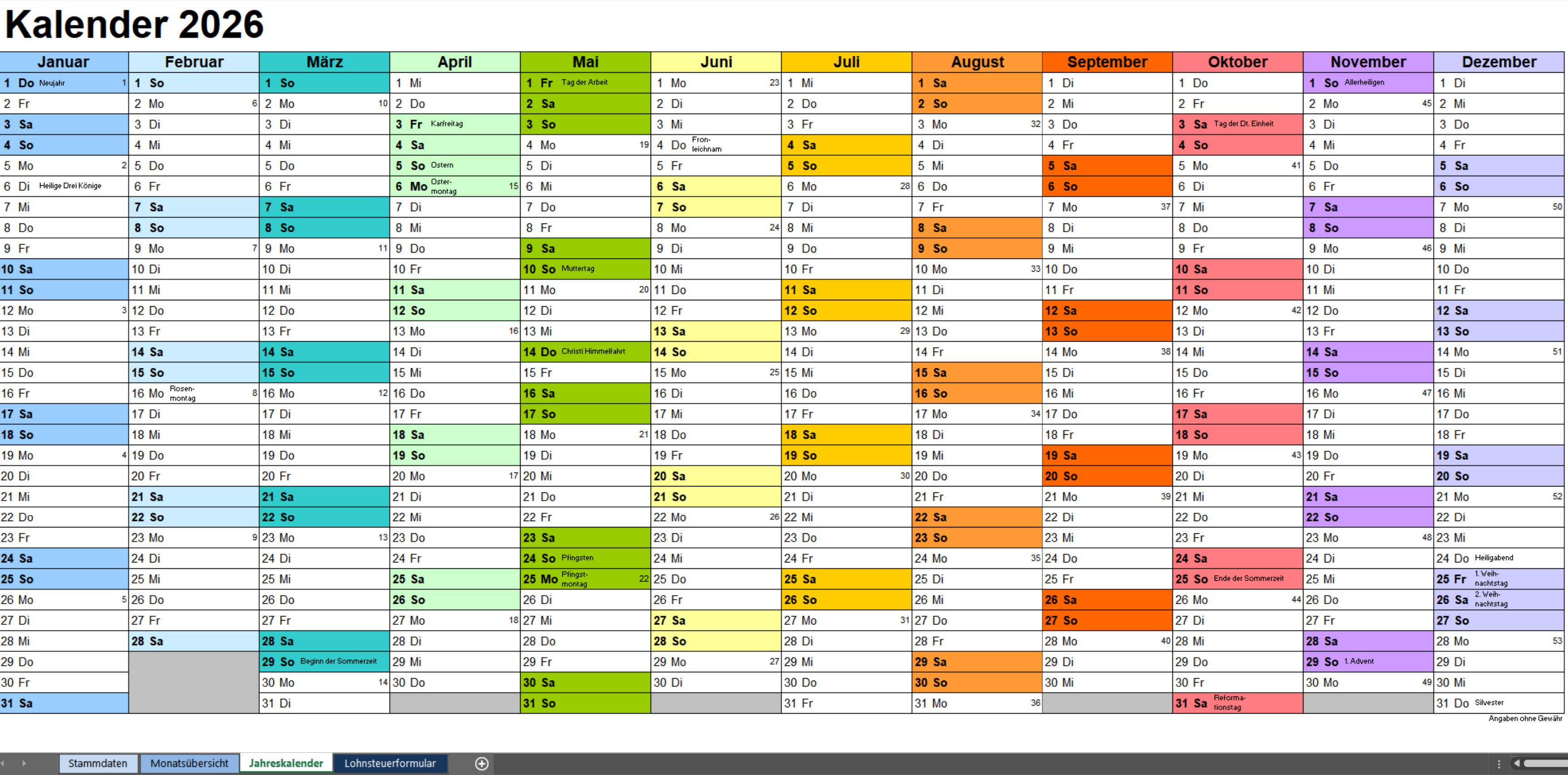 Monatsansichten: Im Bereich oben/links werden auch hier, in den orangenen Feldern die Voreinstellungen eingetragen. Ansonsten wird hier alles automatisch errechnet.