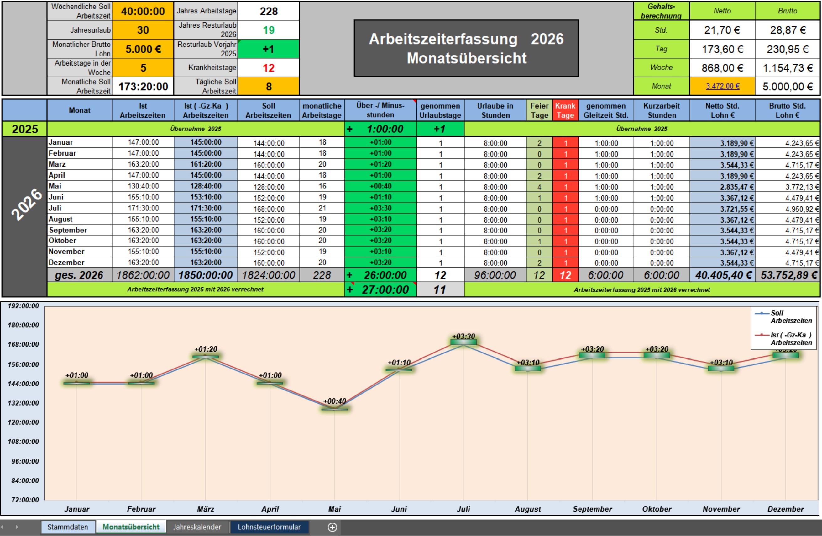- Über-/Minusstunden mit den eingegebenen Gleitzeitstunden & Kurzarbeitsstunden.