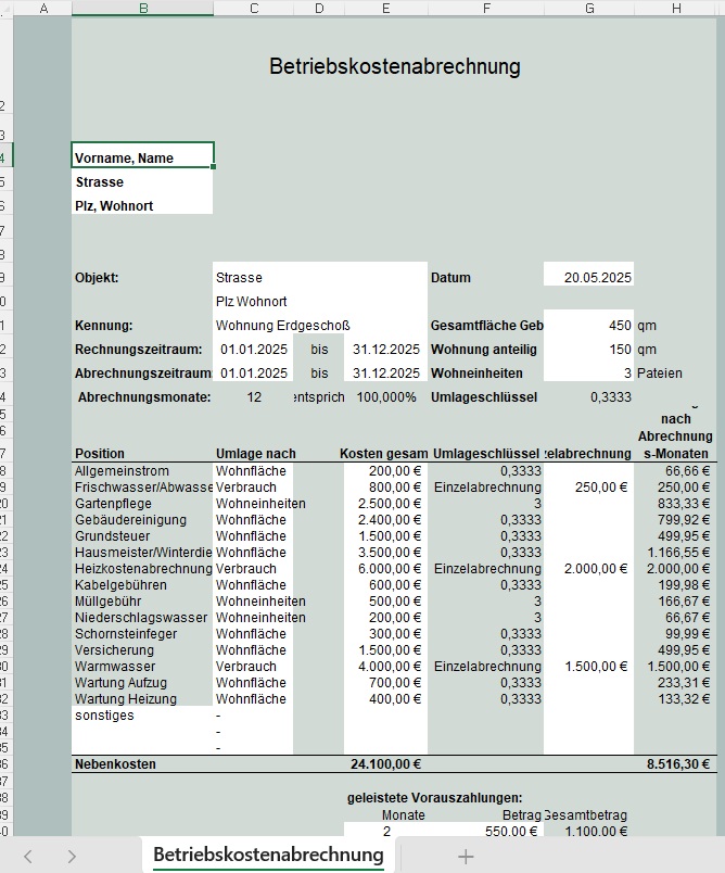 Diese Excel-Vorlage dient der strukturierten Erfassung und Abrechnung von Betriebskosten.