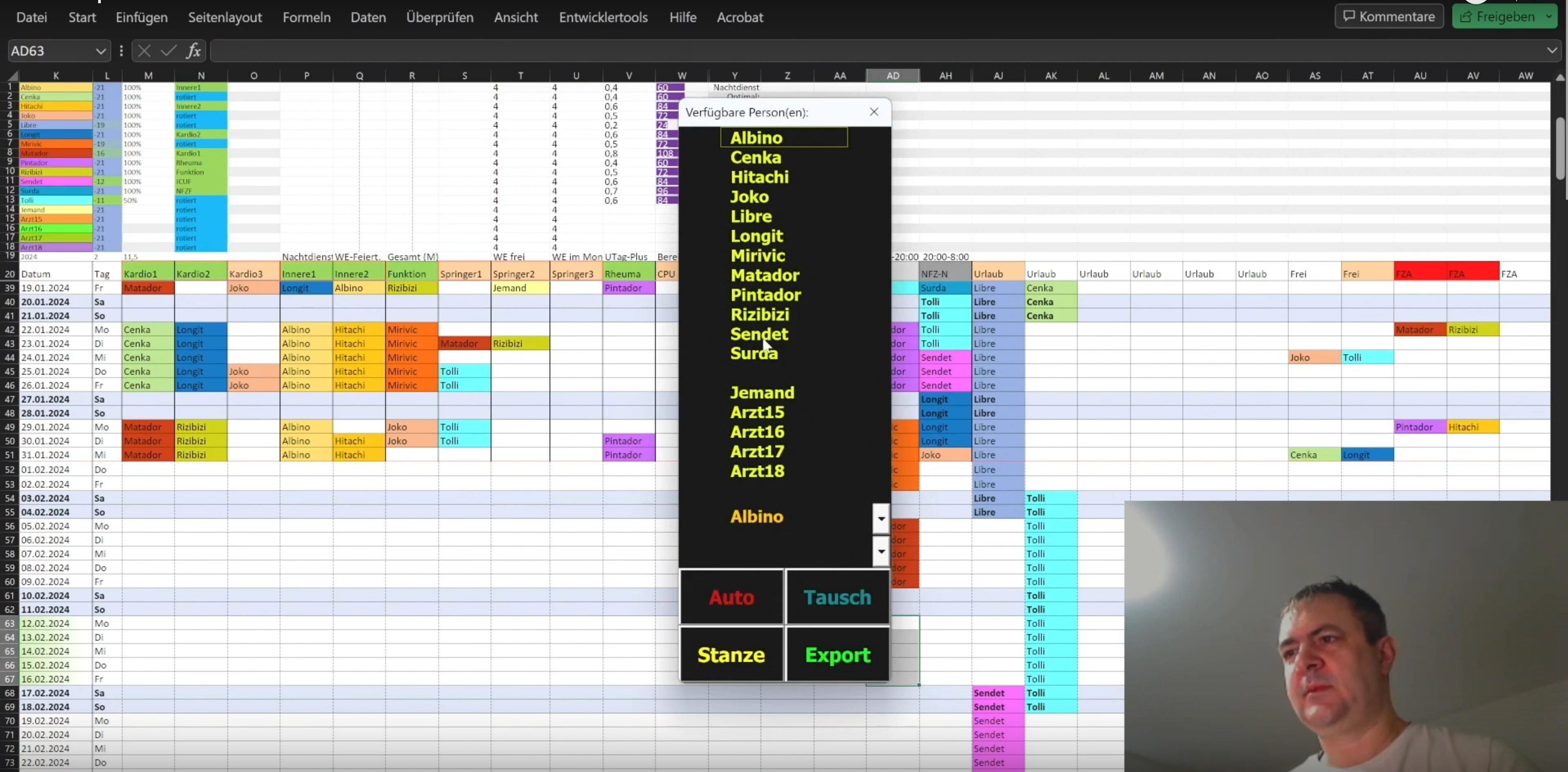 Erstellung eines Dienstplanes im stationären Bereich für Personaloberärzte: Dieses Excel-Tool ist eine Weiterentwicklung des bestehenden (ohne Makro) gleichnamigen Tabellensystems mit neuen Funktionen. Im Eingabebereich wird mit rechter Maustaste ein Makro aufgerufen. Die am Tag noch zur Verfügung stehende Personen werden angezeigt und in den markierten Bereich per Mausklick eingefügt.